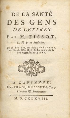 Asimismo en el opúsculo de Monsieur Tissot, De la Santé des gens de lettres (1ª ed., 1768) se recomienda que los letrados no se alimenten de bestias de carne tierna, excepto el pato y la oca. Y se insiste en lo recomendable del pescado con escamas, los peces de lago, las anguilas, el apio, las uvas, las moras, y, sobretodo, y en grandes cantidades, la achicoria y los albaricoques. Tissot desvela multitud de historias clínicas penosas de jóvenes, extrêmement attaché aux études, que sufren flojeras y parálisis al presentarse la Canícula, asquerosa serosidad en las circunvoluciones cerebrales, y, no se asusten queridos colegas, todos con signos de una lamentable y penosa calidad en su líquido seminal. Con el plexo cordial inflado de sangre y la cabeza llena de pájaros. Son tipos, encima, la mar de tristes.