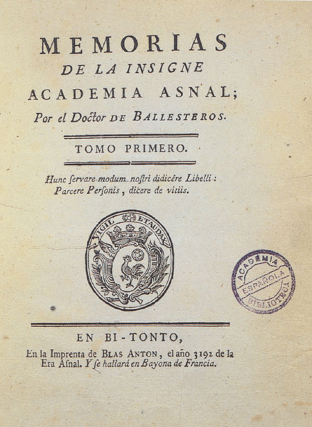 En el último tercio del siglo XVIII vio la luz una curiosa obra burlesca, que se presentaba bajo el título de «Memorias de la insigne Academia Asnal», por el Doctor de Ballesteros, tomo primero, en Bi-Tonto, en la imprenta de Blas Antón, el año 3192 de la Era Asnal.